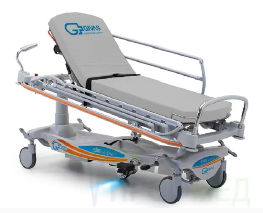 Каталка 2х секционная с изменяемой высотой ложа реанимационная с 5м моторизованным колесом.
